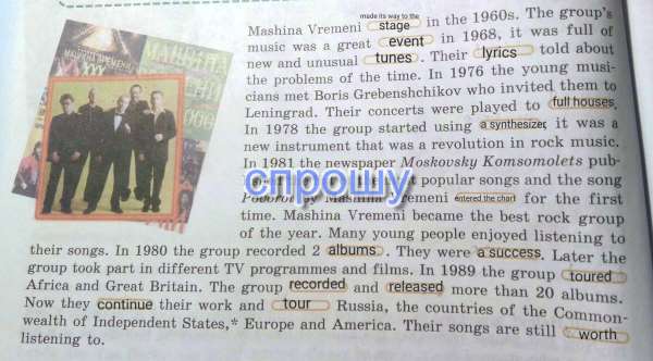 Группа Машина времени организовалась ( собралась) в 1960г. Их музыка была большим событием в 1968, оно было полно новых и необычных звуков . Их стихи говорили о современных проблемах. В 1976 молодые музыканты вмтретились с Гребенщиковым, который пригласил их в Ленинград. Их концерты проходили в переполненных залах. В1978 группа стала использовать синтезаторы, это был новый инструмент сделавший революцию в рок музыке.в 1981 МК опубликовал список наиболее популярных песен и Поворот " Машины Времени" попал в него( список) впервые.Маш Вр стала лучшей рокгруппой года.Многим молодым людям нравилось слушать их песни.в1980 группа записала два альбома. Они получили успех.позже группа приняла участие в различных теле шоу и фильмах. В 1989 был тур по африке и англии. Группа записала и выпустила больше20 альбомов. Сейчас они продолжают свою работу, ездят с турами по россии и странам содружества, а также по незааисимым государствам, европе и америке. Их песни до сих пор стоят того, чтобы их послушали .