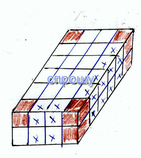 2 закрашенные грани (отмечены синим) имеют 24 кубиков, 8 кубиков имеют 3 закрашенные грани (красным)
