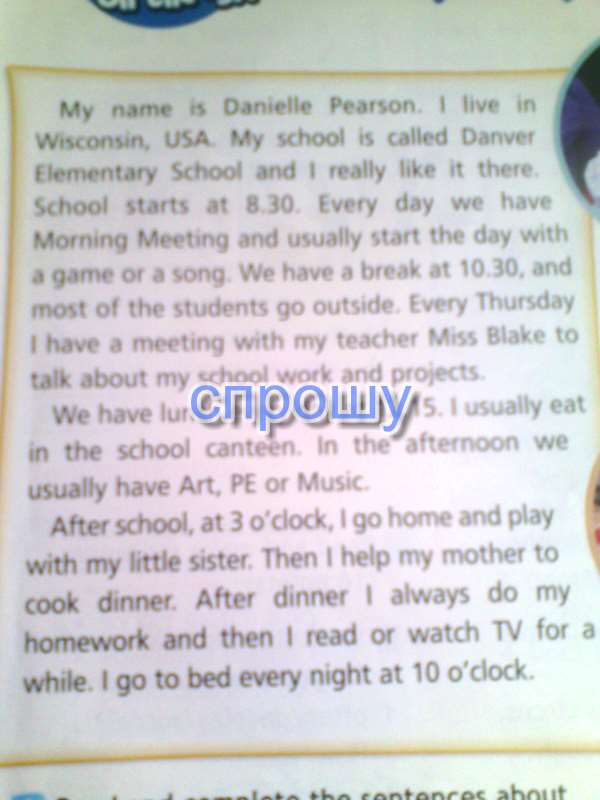 Меня зовут Даниэль Пирсон. Я живу в Висконсине, США. Моя школа называется Начальная Школа Дэнвера, и мне там правда нравится. Уроки начинаются в 8:30.Каждый день у нас Утреннее Приветствие и обычно начинаем день с игры или песни. Перерыв в 10:30, большинство учеников выходят на улицу. Каждый четверг я встречаюсь с моей учительницей Мисс Блэйк чтобы поговорить о школьной работе и проектах. Ланч каждый день в 12:15. Я обычно ем в школьной столовой. утром у нас обычно уроки искусства, физкультуры или музыки. После школы, в 3 часа, я иду домой и играю со своей маленькой сестрой. Потом я помогаю маме приготовить обед. После обеда я всегда делаю домашнюю работу, потом я читаю или смотрю телевизор некоторое время. Ложусь спать в 10 часов вечера.