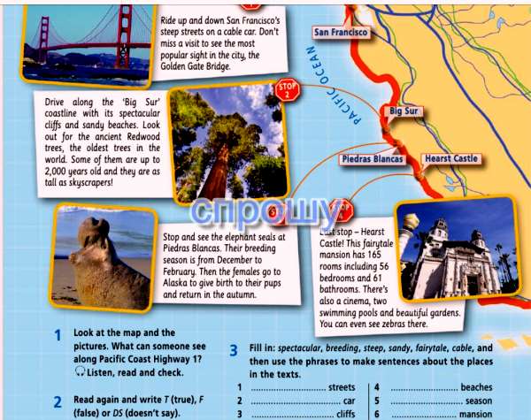 Fill in: spectacular, breeding, steep, sandy, fairytale, cable, and then use the phrases to make sentences about the places in the texts. 1..........streets 2...........car 3...........cliffs 4.........beaches 5...........season 6...........mansion