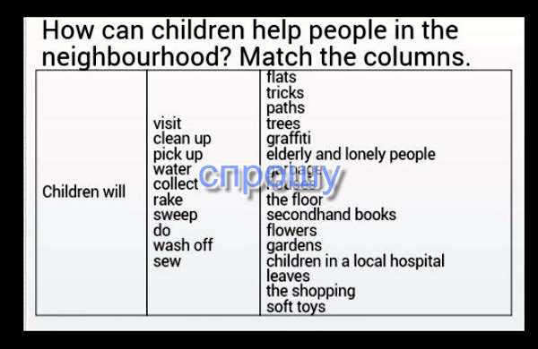 Vocabulary. How can children help people in the neighbourhood? Match the columns. Children will visit, clean up, pick up, water, collect, rake, sweep, do, wash off, sew. Flats, triks, paths, trees, gtaffiti,
