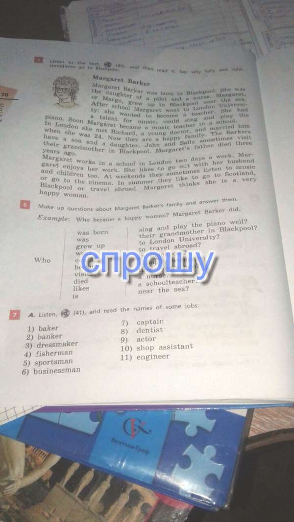 Маргарет Баркер родилась в городе Блэкпул, она была дочерью пилота и медсетрыe Маргарет или Марго выросла в Блэкпуле у моря после школы Маргарет отправилась в Лондон уневерситет она ходила, чтобы стать учителем она имела талант к музыке может петь и играть на пианино в ближайшее время Маргарет стала учителем музыки в школе в Лондоне она встретила Ричерт молодой врач и вышла за него замуж, когда ей было 24 теперь они счастливая семья Баркера есть сын и дочь Джона и Салли иногда посещают их бабушку в отца Блэкпул Маргарет умерла три годâ назад Маргарет работает в школе в Лондоне два дня в неделю Маргарет любит свою работу она любит ходить с мужем и детьми тоже по выходным они иногда слушают музыку или сходить в кино летом они любят ходить в Шотландии Блэкпул или тревел за границей Маргарет думает, что она очень счастливая женщина
