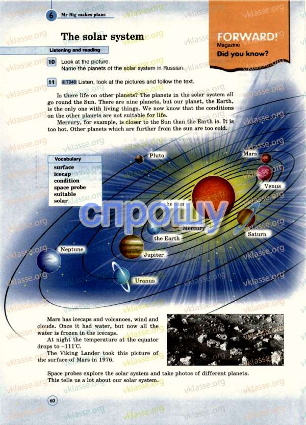 На Марсе есть ледники и вулканы,ветер и облака.Когда-то это была вода,но теперь вся вода замерзла в ледники.Ночью температура на экваторе опустится до-111C.Спускаемый аппарат "Викинг" сделал снимок поверхности Марса в 1976 году.Космические зонды исследуют Солнечную систему и сделать фотографии различных планет.Это многое говорит нам о нашей Солнечной системе,
