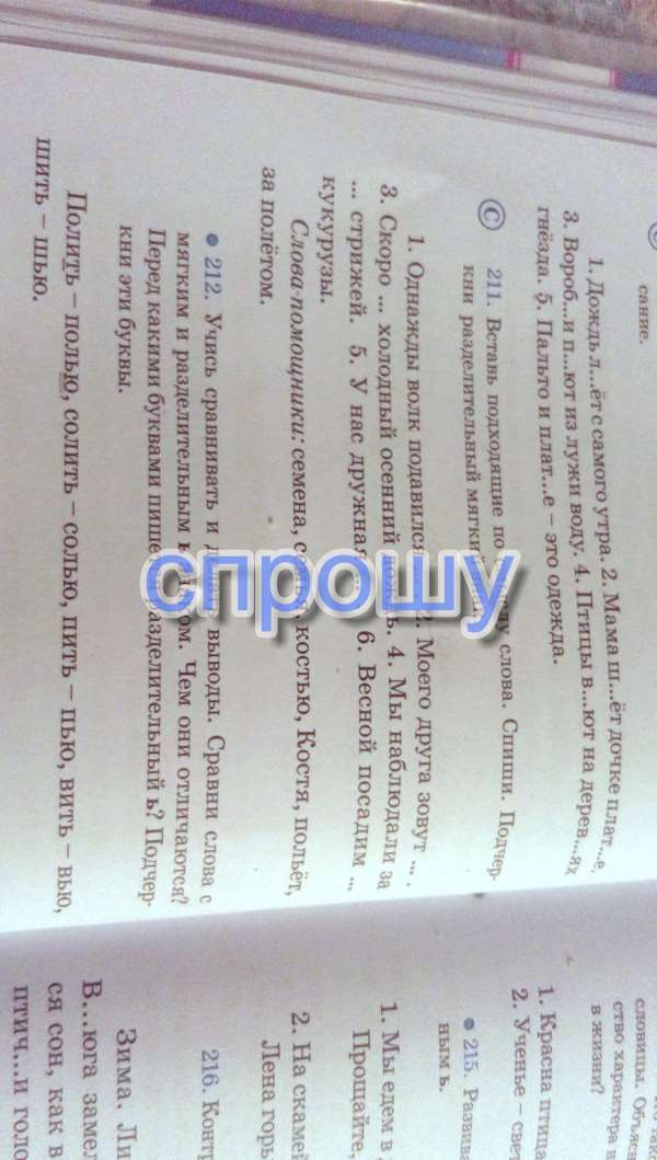 Однажды волк подавился костью.Моего друга зовут Костя.Скоро польет холодный осенний дождь.Мы наблюдали за полетом стрижей.У нас дружная семья.Весной посадим семена кукурузы. подчеркни в словах ь знак.костью,польет,дождь,семья.
