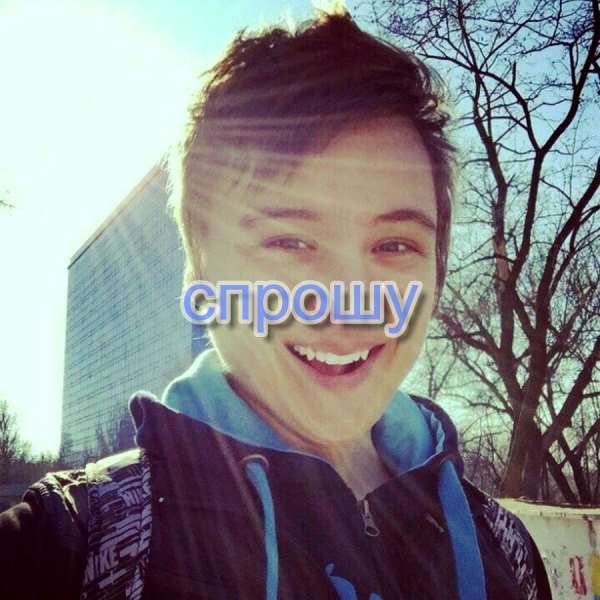 У этого человека на вид очень жизнерадостные глаза. Они красивого голубо-зелёного цвета,зубы белоснежный и острые, достаточно милая прическа. Сами волосы светло-русого цвета, одет он в толстовку черного цвета с синим капюшоном и завязками..