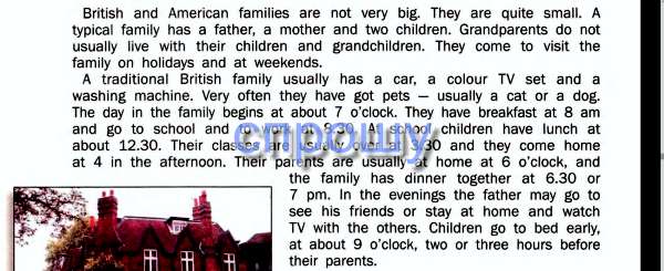 Традиционные Британские семьи имеют машину, цветное телевидение и стиральную машину. Очень часто у них есть питомец - чаще всего это кошка или собака. День в семье начинается в 7 утра. Завтрак у них в 8 утра, потом они собираются в школу и на работу в 8:30. В школе дети обедают в 12:30. В классе они обычно 3,5 часа и домой они уходят в 4 вечера. Их родители обычно приезжают в 6 вечера и семейный ужин у них в 18:30 или 19. Вечером отец встречается с друзьями или смотрит телевизор вместе с семьей. Дети ложаться спать в 9 вечера, на 2 или 3 часа раньше своих родителей.