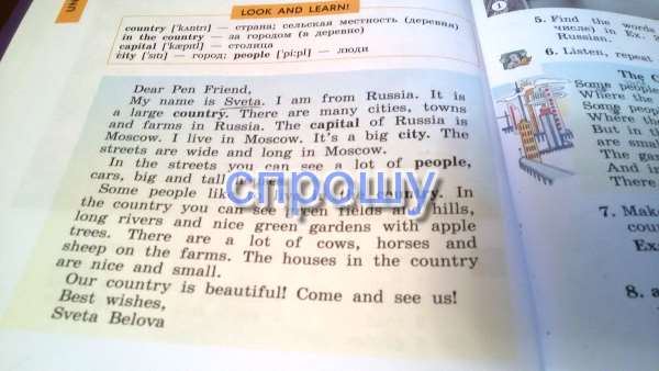 Меня зовут Света. Я из России. Это большая страна. В России много городов,поселков и ферм. Столица России это Москва. Я живу в Москве. На улицах можно увидеть много людей,машин и больших и высоких зданий. Некоторым людям нравится жить за городом. Там можно увидеть много полей и холмов,длинные реки и прекрасные зеленые сады с яблонями. На фермах много коров,лошадей и овец.Дома за городом маленькие и хорошие. Наша страна прекрасная. Приезжай к нас. Всего хорошего.