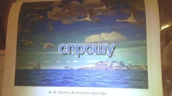 На картине изображена водная гладь, на заднем фоне горы со снежными шапками и корабль с белоснежными парусами. (Я так понимаю это гуси) Стая гусей перелетает море.