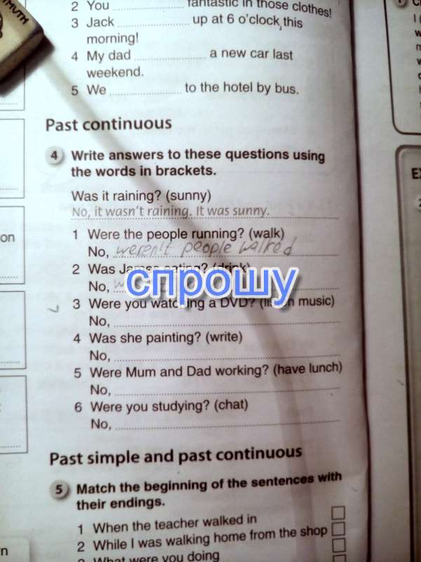 Помогите ответить на простые вопросы по английскому(перевод: 4 Запишите ответы на эти вопросы, используя слова в скобках. Было ли дождь? (Солнечный) Нет, это был не дождь. Было солнечно. 1 были люди работает? (Прогулка) 2 Джеймс едят? (Напиток) Нет 3 Были ли вы смотреть DVD? (Слушать музыку) NO 4 Была ли она живопись? (Запись) Нет, обед) 5 Были ли мама и папа работает? (Есть Нет 6 Были ли вы учитесь? (Чат) Нет