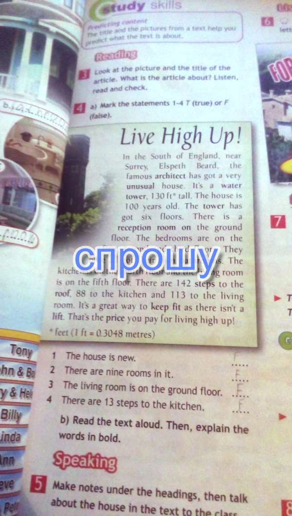 На юге Англии , возле Суррея , у знаменитого архитектора Элспет Бирда есть очень необычный дом . Это водонапорная башня Уэйтс , 130 футов * в высоту. Этому дому около ста лет . В башне шесть этажей . На первом этаже находится приемная . Спальни на первом, втором и третьем этажах . У всех у них собственные ванные комнаты. Кухня находится на четвертом этаже, а гостиная находится на пятом этаже . До крыши 142 ступеньки, 88 - до кухни и 113 до гостиной . Это отличный способ поддерживать себя в форме , потому что в доме нет лифта . Это та цена, которую вы платите за то, что высоко живете.