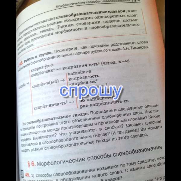 Показано 9 словообразовательных цепочек. Представлены морфемы, с помощью которых образовались производные слова: приставки и суффиксы. Приведены в скобках возможные чередования.