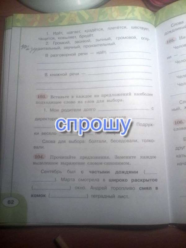 Помогите 102 упр там нужно распределить слова в разговорной речи или в книжной речи и 104 упр фото есть 3 класс