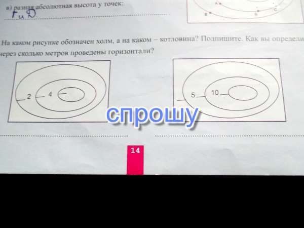 На каком рисунке обозначен холм, а на каком котловина? Подпишите. Как вы определили, через сколько метров проведены горизонтали?