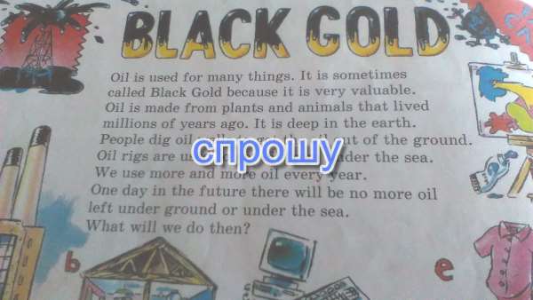 Масло используется для многих вещей .Это иногда называют Черное золото потому что это очень ценно.Масло производится из растений и животных, которые жили милион лет тому назад .Оно глубоко в земле .Люди роют нефтяную скважину, чтобы получить нефть из земли.Нефтяные вышки используются для получения масла из-под моря.Мы используем все больше и больше нефти каждый день .В один прекрасный день в будущем будет на больше нефти остались под землей или под водой.