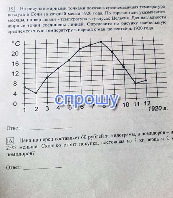 Ответ: 24 градуса, т.к. май-5 месяц, сентябрь-9 месяц. В период между 5 и 9 (по горизонтали) самая высокая температура была 24 градуса (по вертикали)