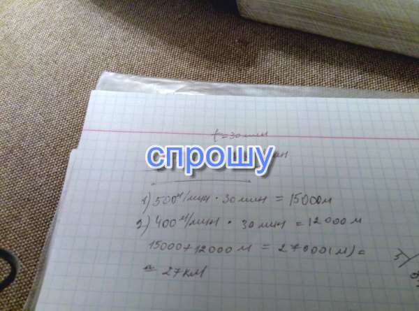 От двух пристаней одновременно навстречу друг другу отплыли два катера. Первый плыл со скоростью 500 м/мин. Скорость второго на 100 м/ мин меньше. Встретились катера через полчаса. Вычисли расстояние между пристанями в километрах.