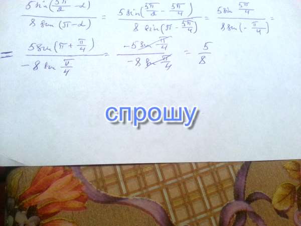 5sin(5pi/2-a)/8sin(pi-a) если а = 5pi/4 решите пожалуйста)))