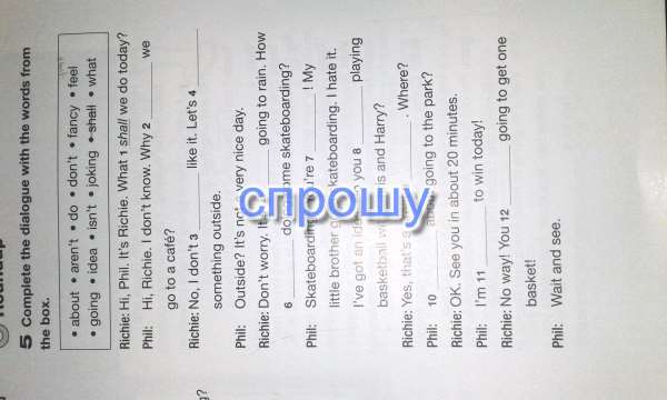 На скейте Ты шутишь! Мой младший брат катается на скейте. Я ненавижу это. У меня идея. Что думаешь насчет того, чтобы поиграть в баскетбол с Крисом и Гарри (fancy обозначает здесь глагол со смыслом воображать, думать представлять)