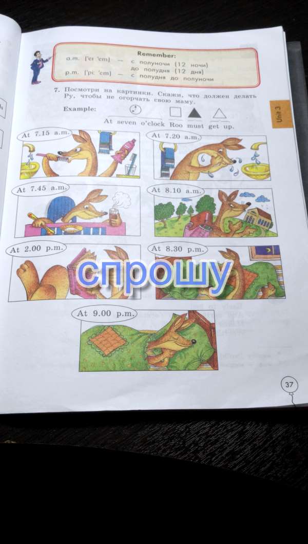 At 7 15 a.m. Roo must clean teeth. В 7 15 Ру должен почистить зубы.