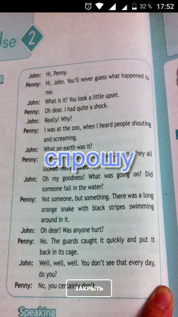 John and Penny recently met each other. John remarked at once that Penny was a little upset, so asked her about the cause. Penny was shocked by the trip to the zoo. She heard people shouting and screaming, then came up to the fountain. John thought, that somebody had fallen in the water, but it was not so. There was a long orange snake with black stripes swimming around in foutain. John asked if anyone hurted, but everything was OK, because guards caught the snake quickly and put it back in itcage. John was very impressed by this story, and Penny too.