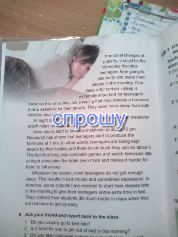 Гормональные изменения полового созревания. Это может быть гормоны, которые останавливают подростков от ложиться спать рано и делают их сонным утром. Одна вещь наверняка сон крайне важен для подростков, потому что в то время как они спят, что они выпускают гормон, который имеет важное значение для их роста. Они нуждаются в большем количестве сна, чем у детей и взрослых. мелатонин М ночь наше тело производит гормон темноты ", который помогает нам заснуть. Большинство взрослых людей начинают производить мелатонина около 10 часов вечера. Исследования показали, что подростки начинают производить гормон в 1 час ночи, Другими словами, подростки в настоящее время бодрствовал своими телами и не так много они могут с этим поделать. Тот факт, что они играют в компьютерные игры и смотреть телевизор поздно ночью стимулирует мозг еще больше и делает его более трудным для них, чтобы заснуть. Независимо от причины, большинство подростков не получают достаточного количества сна. Это приводит к тому плохое настроение, а иногда и депрессии. В Америке, некоторые школы решили начать свои занятия позже утром, чтобы дать подросткам некоторое дополнительное время в постели. Они заметили, что их студенты сделали гораздо лучше в классе, когда у них не было рано вставать. это примерный перевод