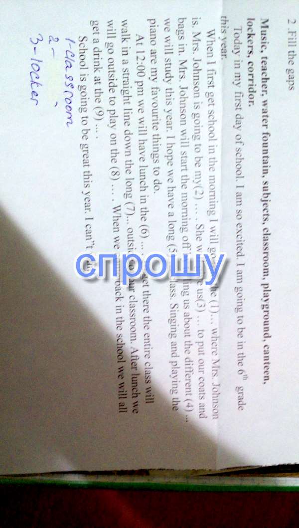 1-classroom 2-teacher 3-locker 4-subjects 5-music 6-canteen 7-corridor 8- playground 9-water fountain