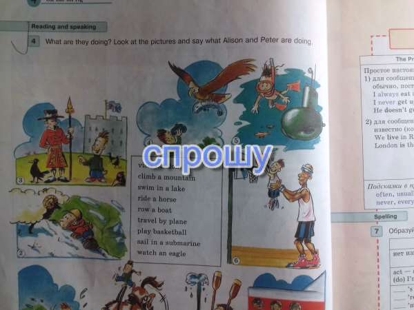 Пощещает Лондон забирается на гору плавает в озере катается на лошади катается на лодке путешествует на самолёте играет в баскетбол смотрит через субмарину смотрит на орла