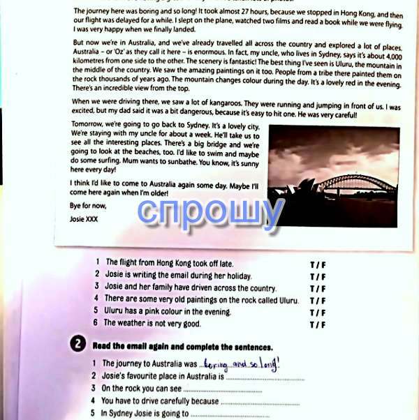 1. Boring and long 2. The mountain Uluru 3. The paintings 4. There are a lot of kangaroos running around 5. Look at a big bridge and the beaches. She also wants to go swimming and surfing (второе предложение не обязательно, хотя можно добавить тоже). Это продолжения предложений, начала написаны в книге