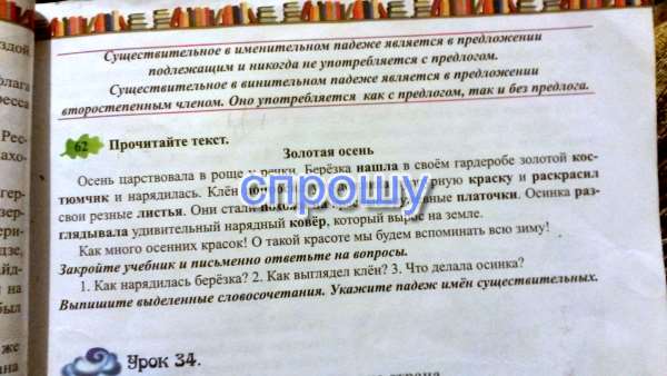 нашла костюмчик (винит. падеж), попросил краску (винит. падеж), раскрасил листья (винит. падеж), похожи на платочки (винит. падеж), разглядывала ковер (винит. падеж).