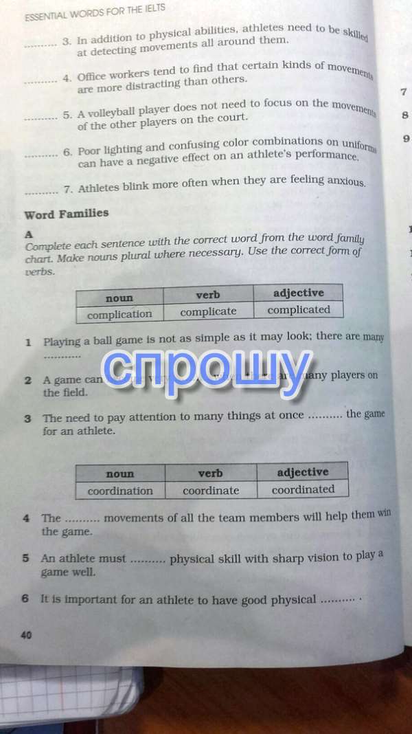 A 1 complications; 2 complicated; 3 complicates; 4 coordinated; 5 coordinate; 6 coordination; 7 demonstration; 8 demonstrate; 9 demonstrative; 10 performs; 11 performance; 12 performers; 13 tolerant; 14 tolerate; 15 tolerance; 16 visual; 17 visually; vision