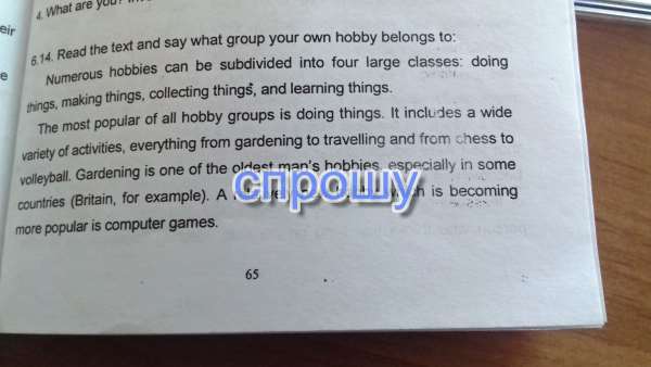 Многочисленные увлечения можно разделить на 4 больших класса: чем-то заниматься (в смысле какие-то дела) , что-то делать (возможно руками, подделки и т.д) , что-то коллекционировать вещи, и учить что-то. Самая популярная группа из всех, это чем-то заниматься. Он включает в себя разнообразные виды деятельности, все, начиная от садоводства , путешествий и заканчивая шахматами и волейболом. Садоводство является одним из старейших увлечений человека особенно в некоторых странах(Великобритании например). Касательно нового хобби, которое становится все более популярнее это компьютерные игры.