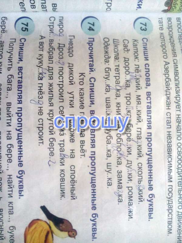 Спиши слова,вставляя пропущенные буквы.73,74
