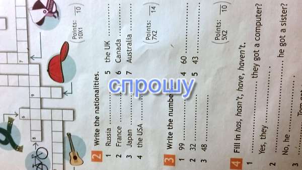 2) 1. Russian 2. French 3. Japanese 4. American 5. British 6. Canadian 7. Australian 3) 1. Ninety-nine 2. Thirty-two 3. Forty-eight 4. Sixty 5. Forty-three