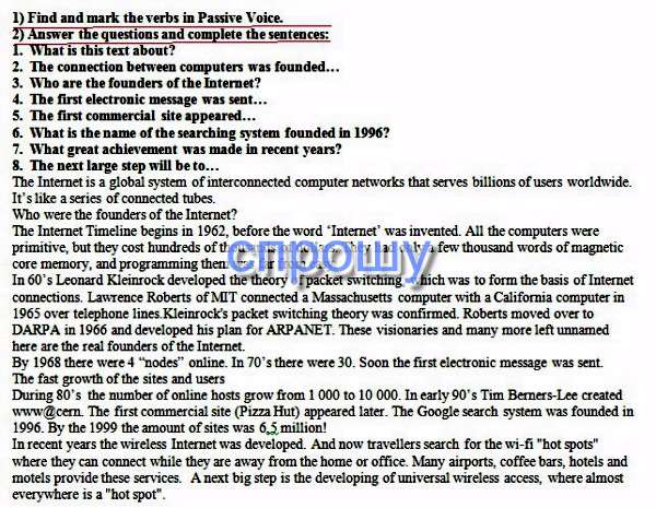 В скобках будут именно глаголы в пассивной форме указаны 1. The Internet Timeline begins in 1962, before the word ‘Internet’ (was invented). Kleinrocks packet switching theory (was confirmed). Soon the first electronic message (was sent). The G00gle search (was founded) in 1996. In recent years the wireless Internet (was developed). Вроде ничего не пропустила, если что-то не дописала, сорри тогда 2) 1. The text is about the history of the Internet development. 2. In 1965 3. Leonard Kleinrock and Lawrence Roberts are the real founders of the Internet which were mentioned in the text. 4. In 70s (хотя дата не упоминается в тексте) 5. In 90s 6. The G00gle search is the searching system founded in 1996. 7. In recent years the wireless Internet was developed. 8. Develop universal wireless access.