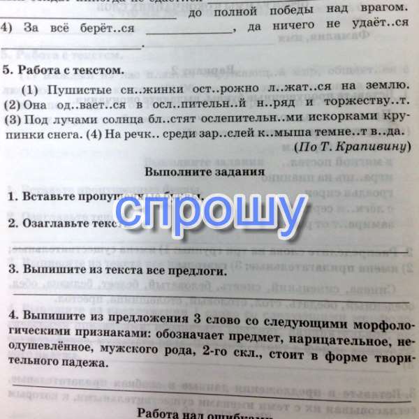 Первый снег. Пушистые снежинки осторожно ложатся на землю. Она одевается в ослепительный наряд и торжествует. Под лучами солнца блестят ослепительными искорками крупинки снега. На речке среди зарослей камыша темнеет вода. 1- на, 2- в, 3-под, 4- на. лучами--4 задание