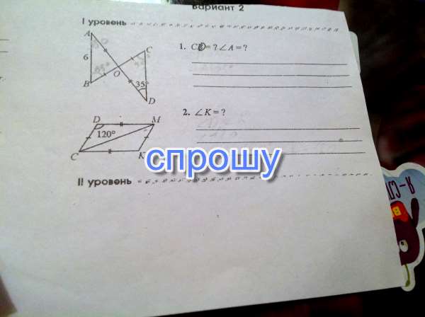 Задача1. Мы имеем два одинаковых треугольника, т.е. при наложении они совпадут. у него стороны равны, углы равны.