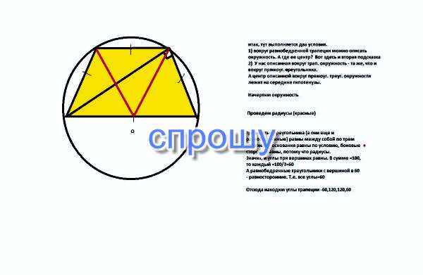 Пожалуйста! Соляної! Діагональ рівнобічної трапеції перпендикулярна до бічної сторони, а менша основа дорівнює бічній стороні. Знайдіть кути трапеції!