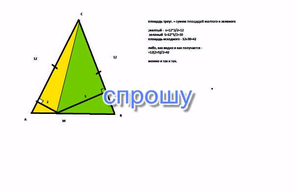 Дано треугольник ABC, AC = BC = 12, точка М лежит на стороне АС, расстояние от точки М до АС равно 2, расстояние от точки М до ВС равно 5. Найти площадь треугольника АВС?