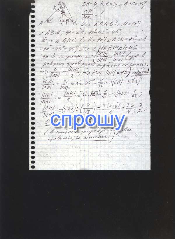 В треугольнике ABC высота BM пересекает высоту CK в точке H, BH = 4, HM = 3 и угол BAC = 45 градусов. Чему равно CH : HK ?