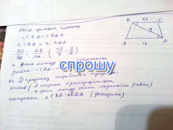 Основания BC и AD трапеции ABCD равны соответственно 4,5 и 18, BD = 9. Докажите, что треугольники CBD и BDA подобны