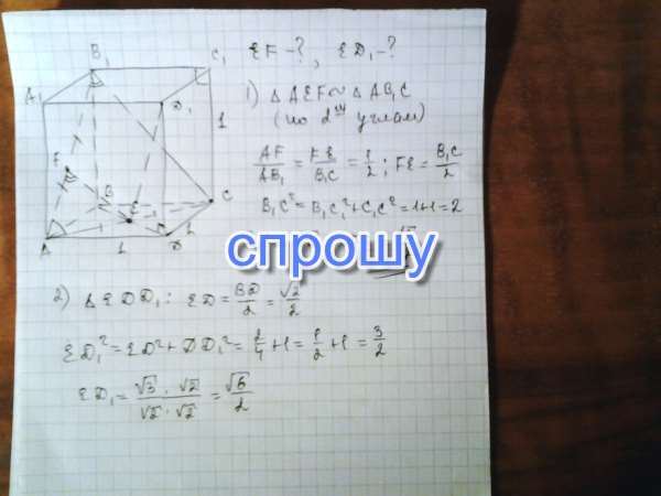 На диагонали грани АВ1 куба АВСДА1В1С1Д1 взята точка F-середина этой диагонали;на прямой АС взята точка Е такая,чтоточка С является серединой отрезка АЕ.Считая ребро куба равным 1,найти расстояние от точки Е до точек Д1 и F