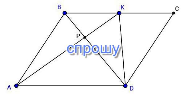 На стороне BC параллелограмма ABCD выбрана точка K. Отрезки AK и BD пересекаются в точке P. Площадь параллелограмма ABCD равна 24, а площадь четырёхугольника PKCD равна 10. Найдите площадь треугольника APD.(можно чертеж и решение?)
