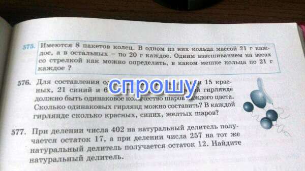 Из первого взять 1 кольцо из 2-го 2, из третьего 3, из 4-го - 4, из 5-го 5, из 6-го 6, из 7-го 7. из 8-го 8. получится 1+2+3+4+5+6+7+8=36 колец и взвесить. если все кольца были бы настоящие то их вес был бы 36*20 =720 г. если фальшивые были в первом пакете то вес будет 721 г поскольку мы из него взяли 1 кольцо . если во втором то вес будет 722, если в 3 вес будет 723, если в 4 будет 724, если в 5 вес будет 725,если в 6 - 726 г, если в 7 вес будет 727 г, если в 8-м то вес будет 728.