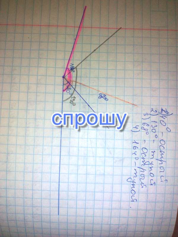 Проведите луч. Отложите от этого луча угол,градусная мера которого равна1)40°2)130°3)68°4)164°. Определите вид каждого из построенных углов.