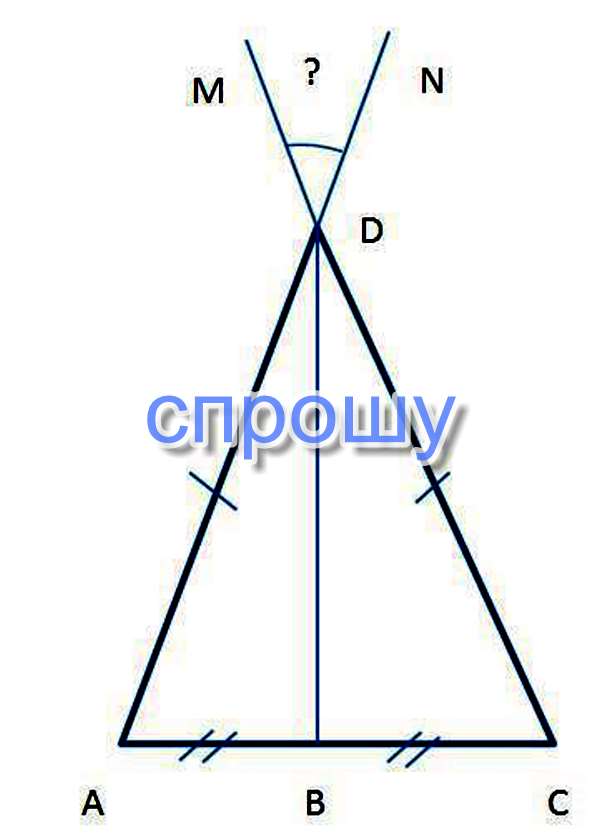 Т.к треугольник прямоугольник равноб-ый то медиана это биссиктриса и высота , а DB медиана т.к. делит AC на 2 равных отрезка AB и BC =gt; угол BDS = углу BDA =gt; угол BDA = 35 , а т.к. DB биссиктриса то угол ADC = 70 =gt; угол MDN = 70 т.к. угол MDN вертикальный углу ADC