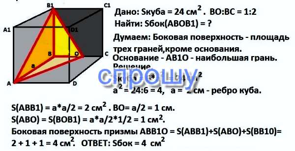ABCDA1B1C1D1-куб, точка O лежит на луче BC так, что BC:CO = 2:1. Вычислите площадь боковой поверхности пирамиды BAB1O , если площадь полной поверхности куба равна 24 см