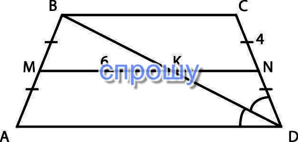 В. ABCD – трапеция, AM = BM = CN = DN. ∠ADB = ∠CDB, MK = 6 см, CN = 4 см. Найдите РABCD.