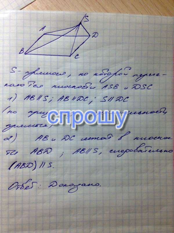 .Точка S не лежит в плоскости параллелограмма ABCD. Докажите , что линия пересечения плоскостей SAB и SCD параллельна плоскости параллелограмма. ОБЯЗАТЕЛЬНО С РИСУНКОМ