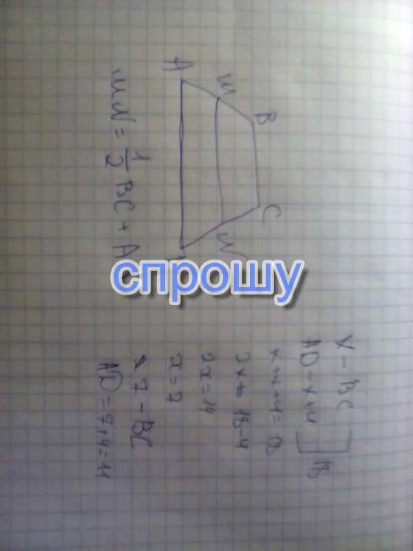 Дана трапеция ABCD. AB||BC. MN-средняя линия трапеции. MN = 18 см. Одно из оснований трапеции больше другого на 4 см. Найти эти основания трапеции