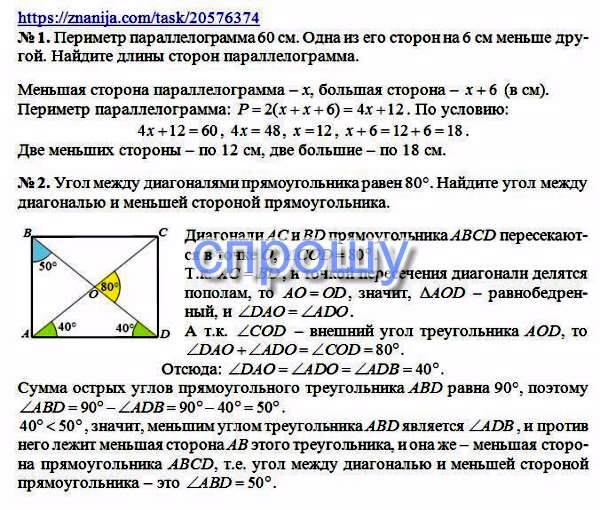 № 2. Угол между диагоналями прямоугольника равен 800. Найдите угол между диагональю и меньшей стороной прямоугольника.